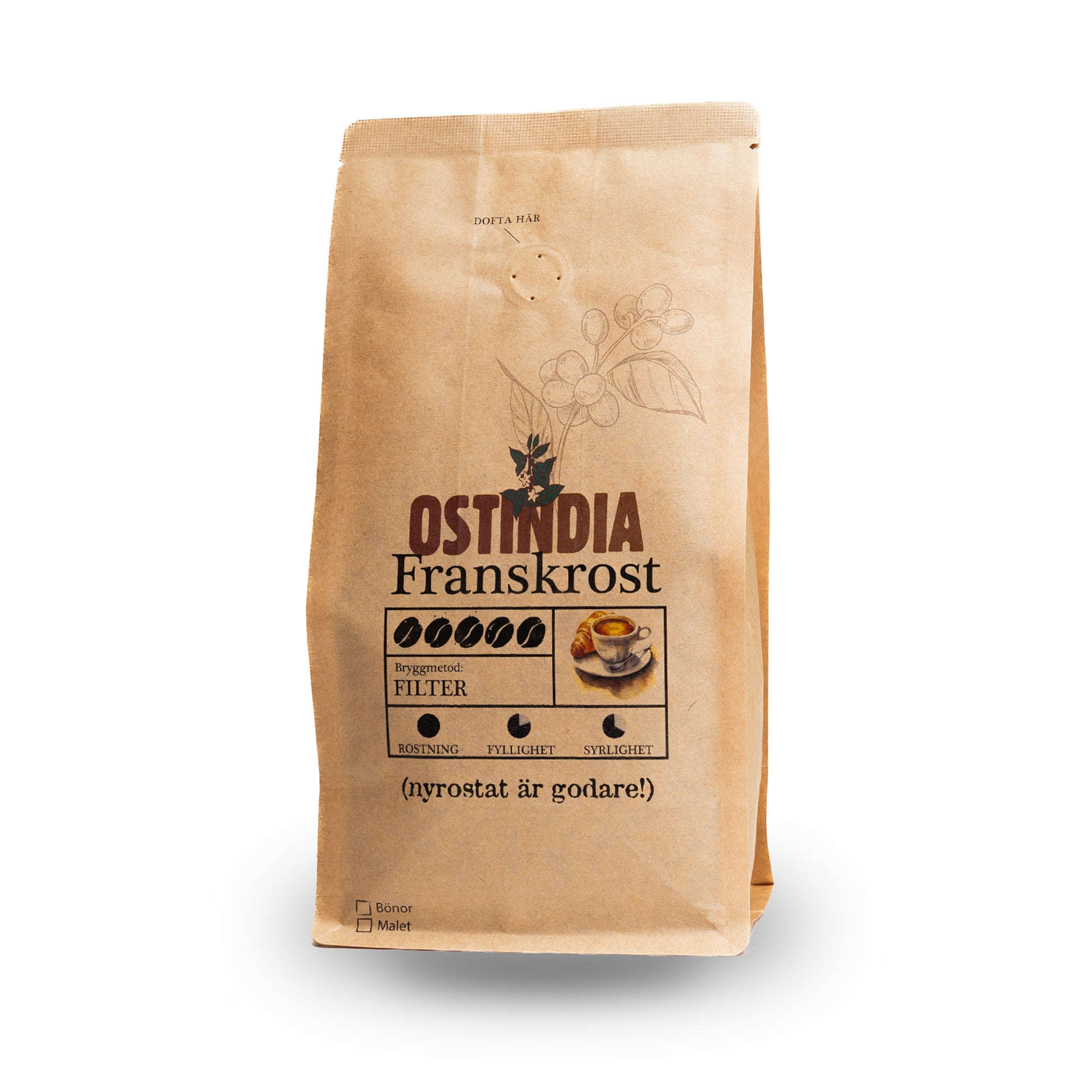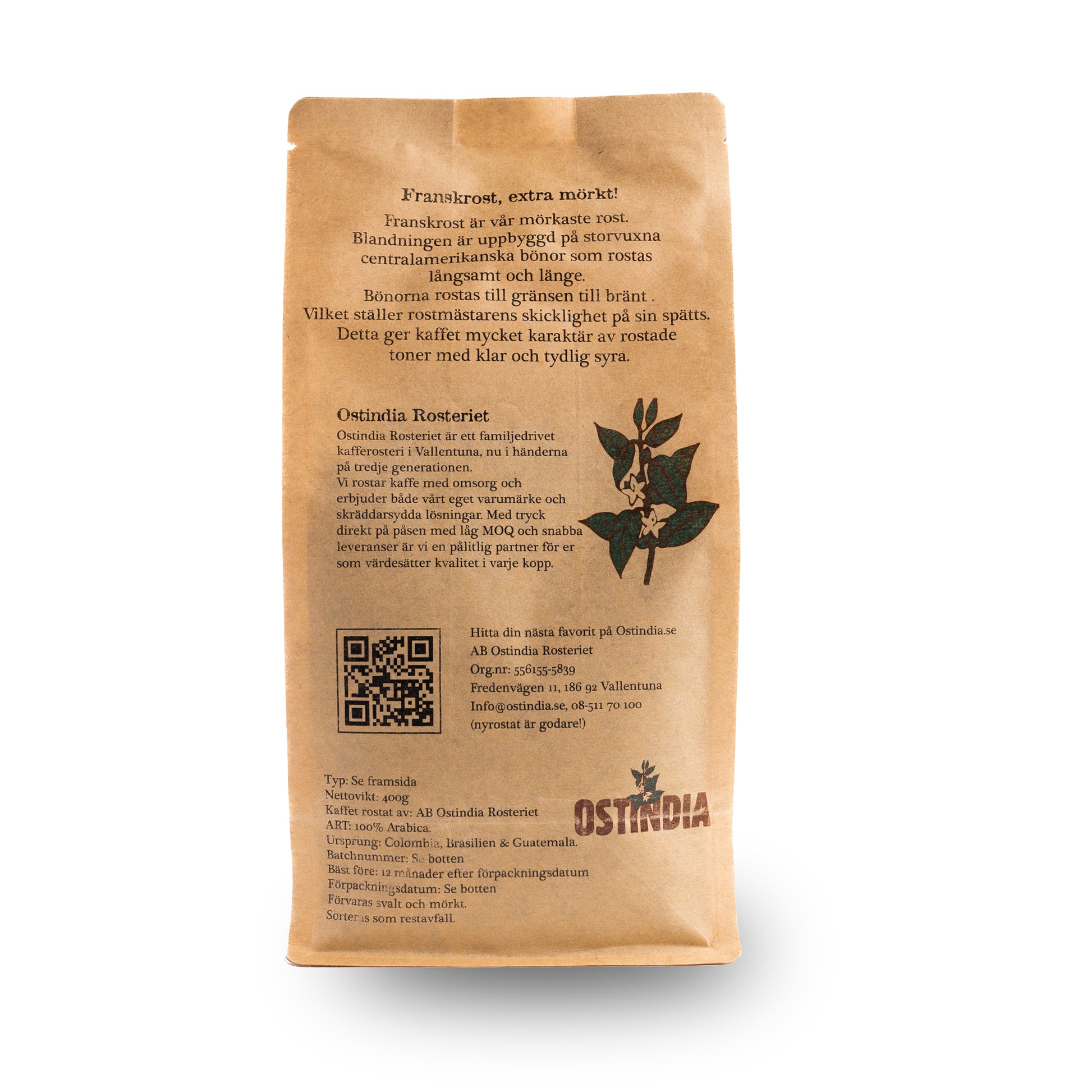 Vår franskrost är våran mörkaste rost. Blandningen är uppbyggd på storvuxna centralamerikanska bönor som rostas långsamt och länge. Bönorna rostas till gränsen för bränt kaffet med små marginaler vilket ställer rostmästarens skicklighet på sin spätts. Detta ger kaffet mycket karaktär av rostade toner med klar och tydlig syra.